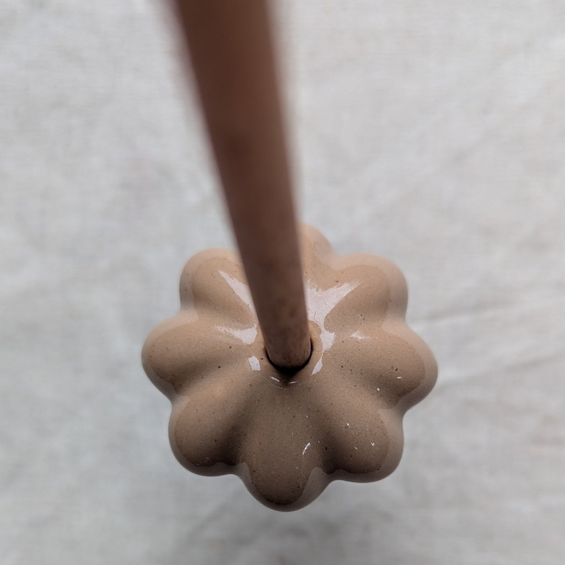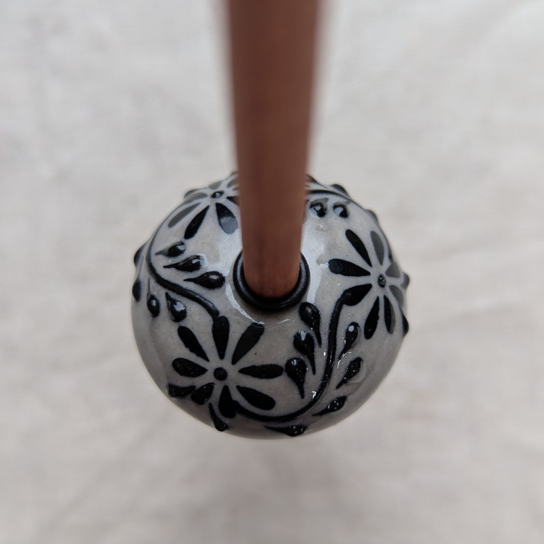 This support spindle is made in Michigan from hand-shaped pine shafts and ceramic whorls. The spindles measure approximately 12" long and are designed to be used with a spinning bowl. You can find Spun's Ceramic Spinning bowls here.