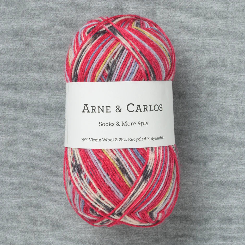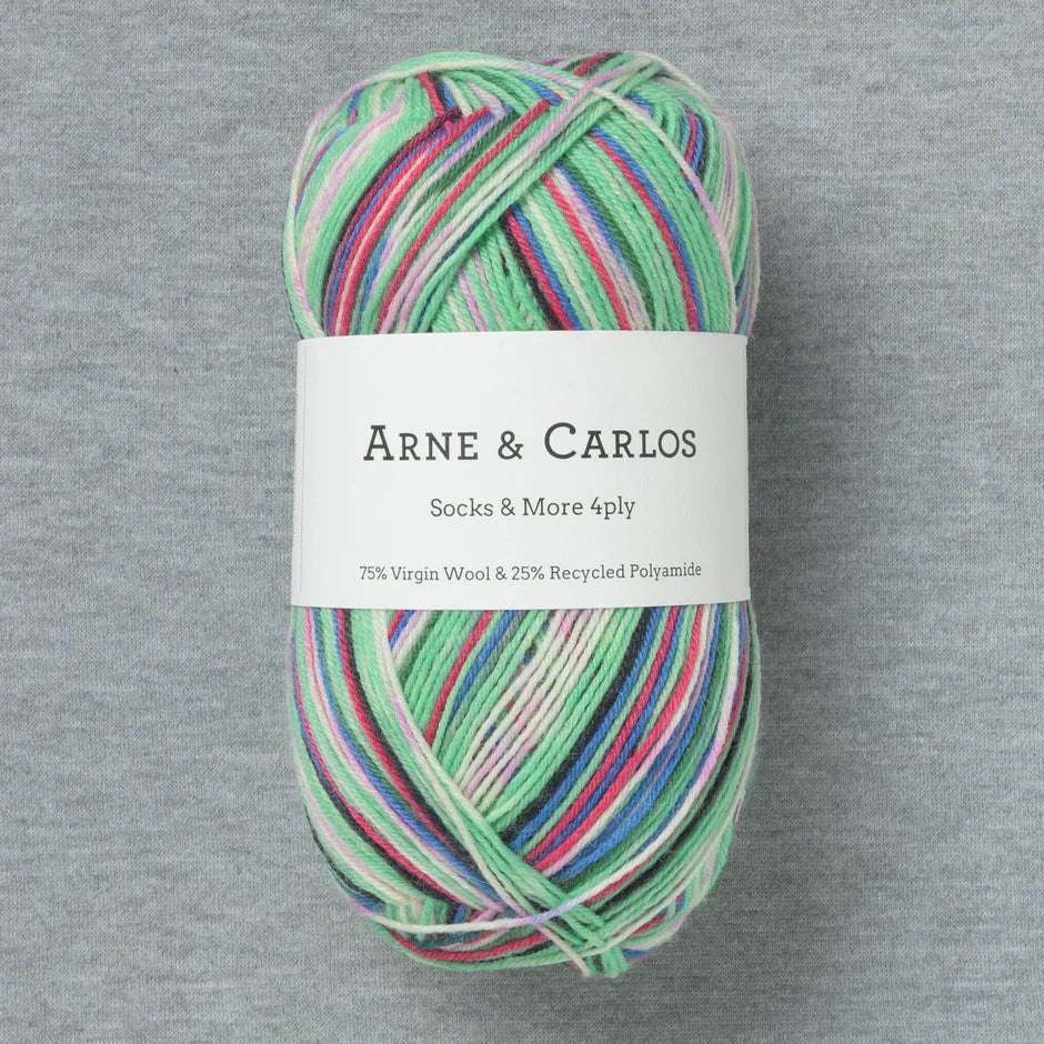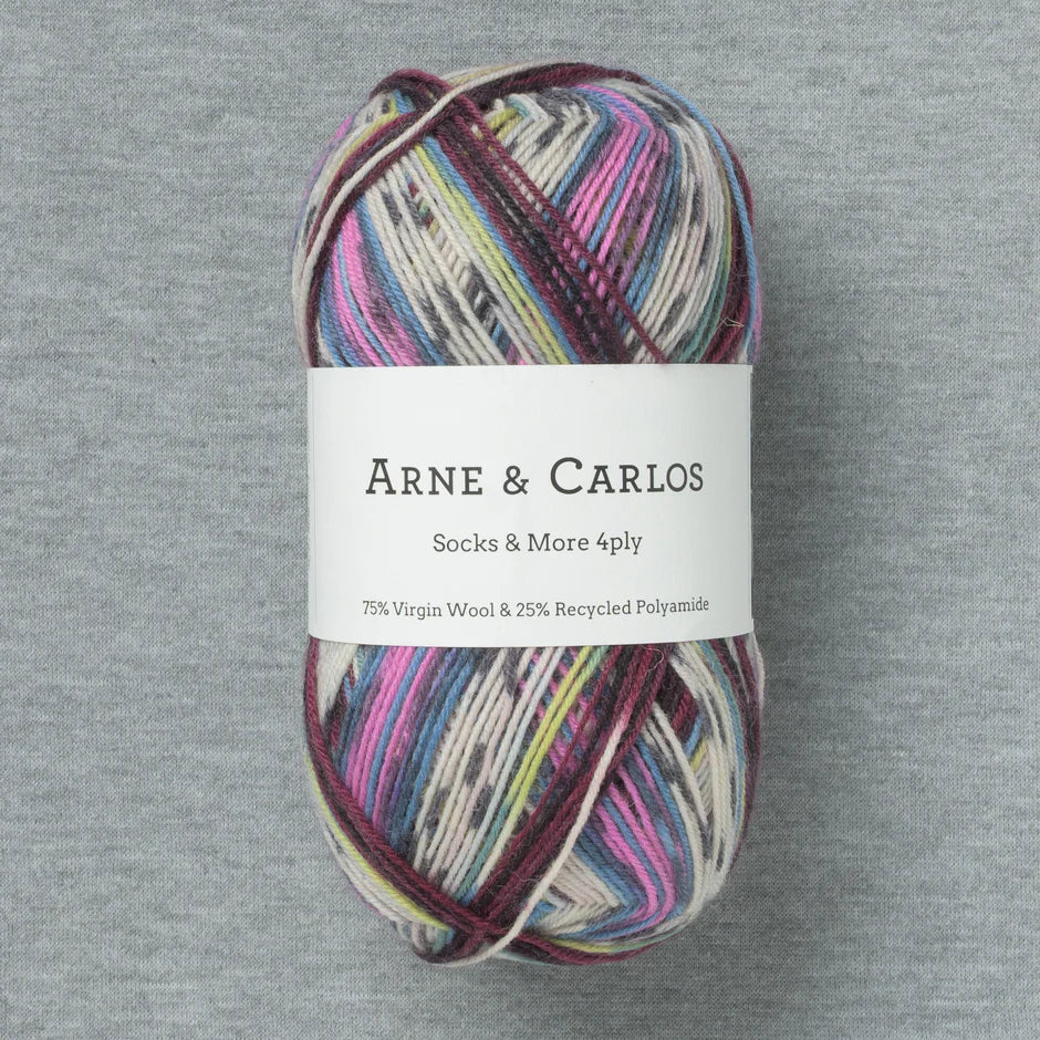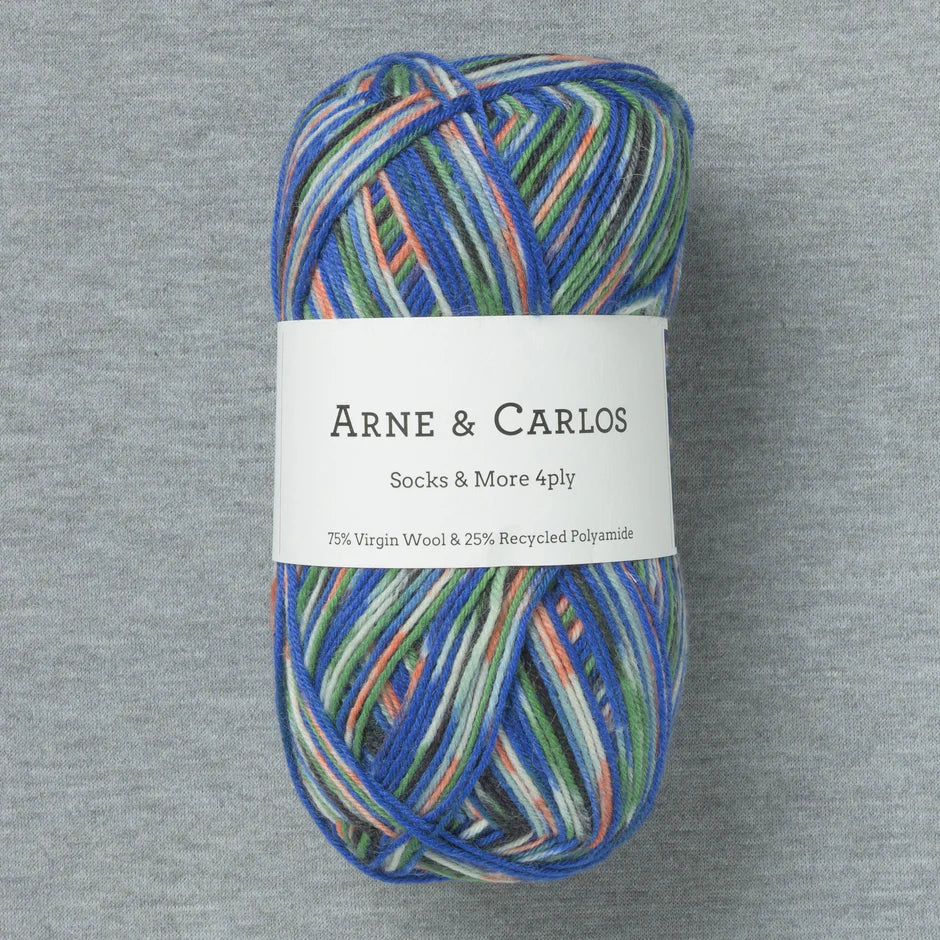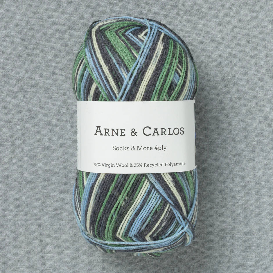 Sock & More 4-Ply, designed by the knit superstar duo Arne & Carlos, is a gorgeous and durable fingering weight yarn that's perfectly suited for socks (of course!). Each self-patterning colorway draws inspiration from traditional Scandinavian colorwork and from the beauty of nature. Spun with a blend of wool & recycled nylon (polyamide), Socks & More 4-Ply is soft, hard-wearing, and eco-friendly, granting nylon a second life on your feet. Hand or machine wash, gentle cycle, and lay flat to dry.