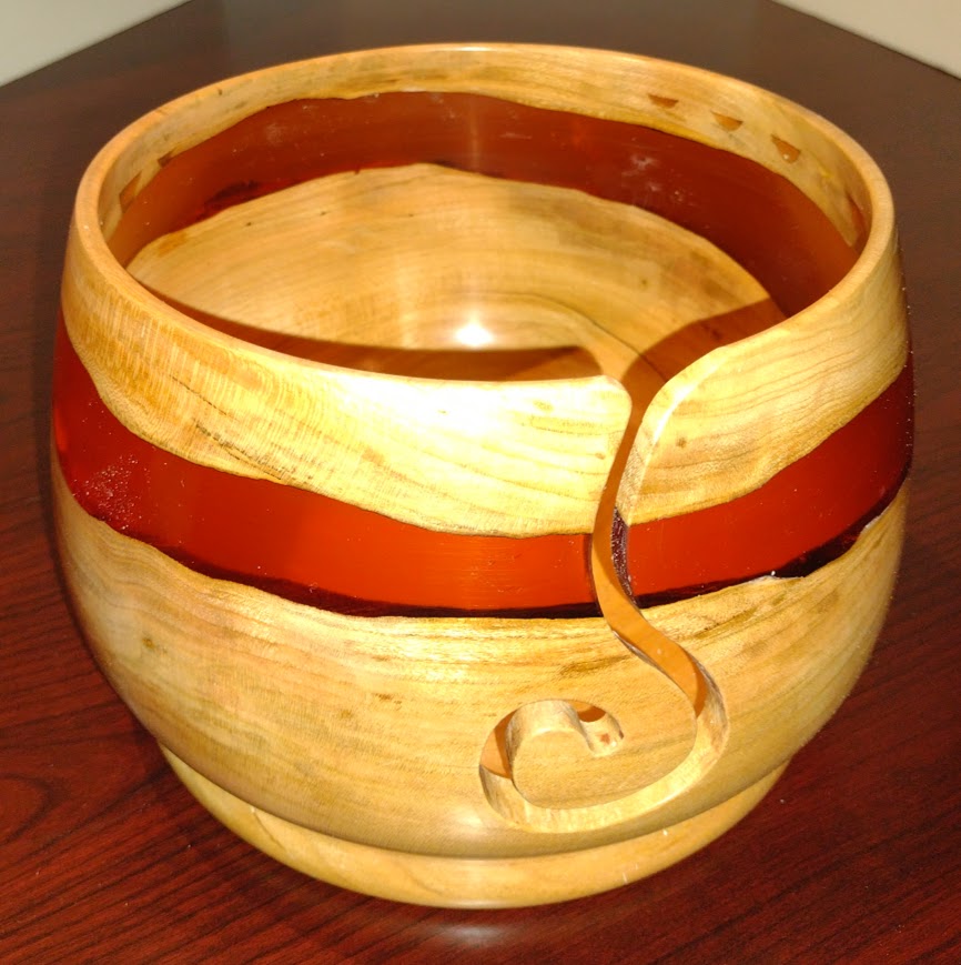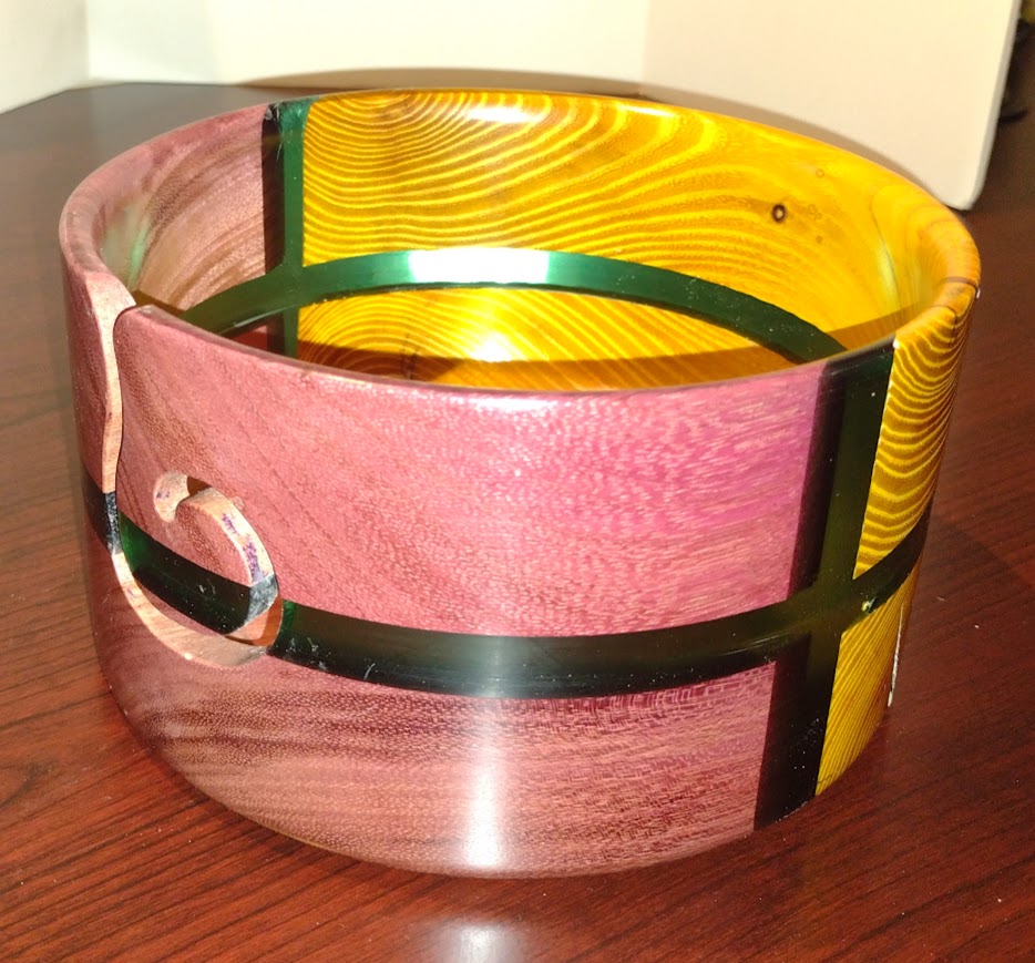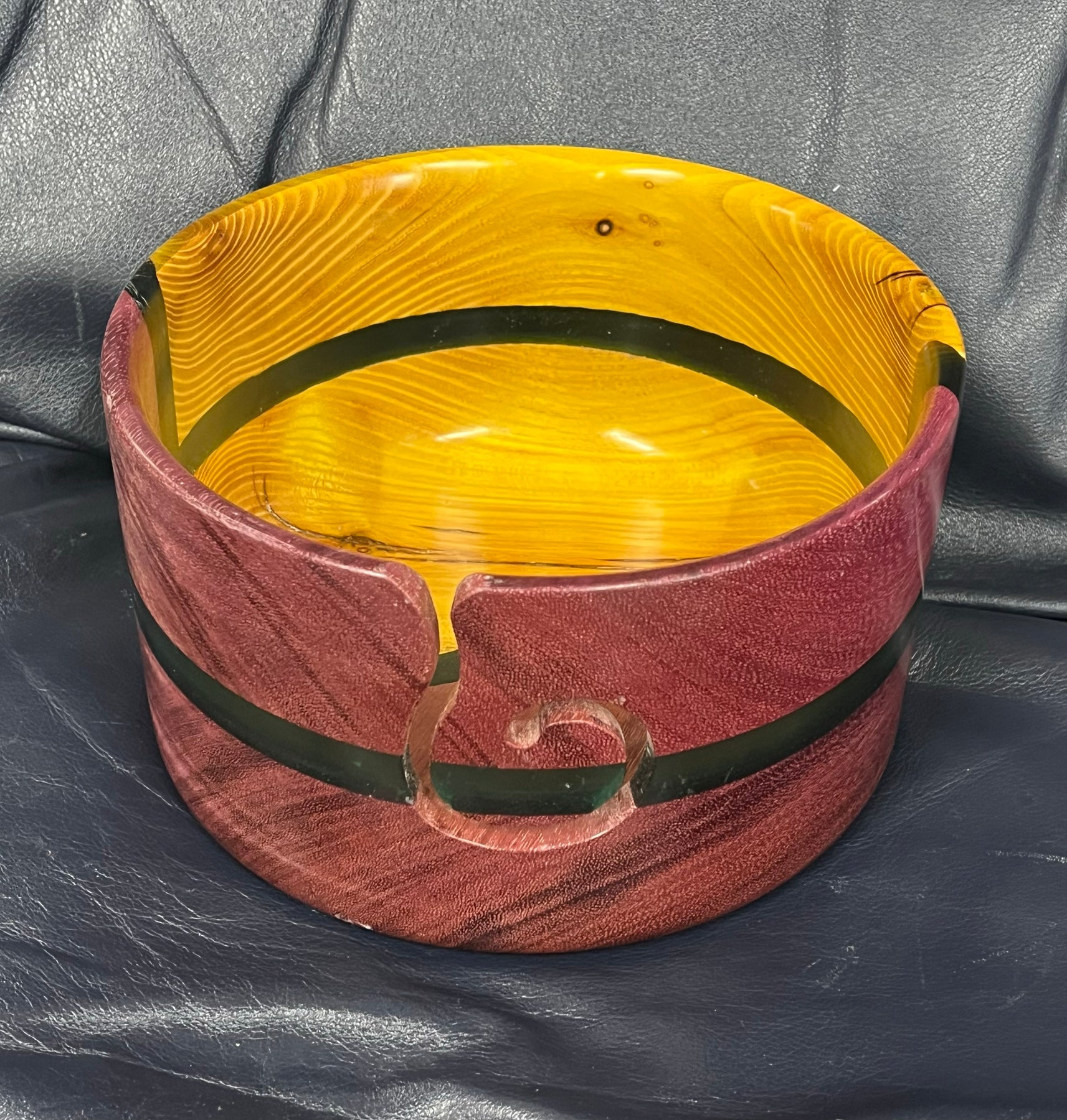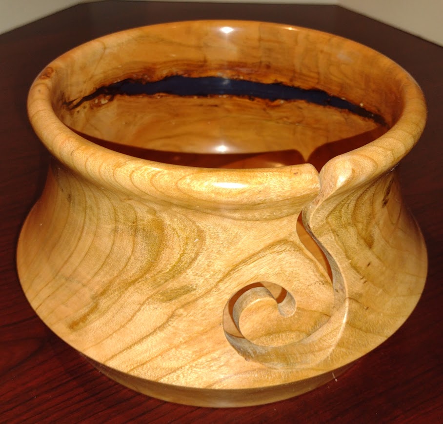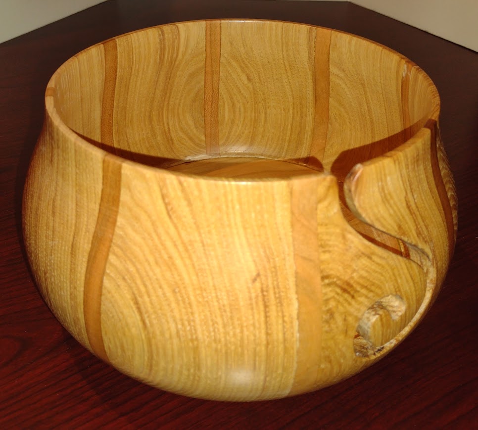 Each of these yarn bowls, handmade in Michigan by Andrew Scott, is a unique and stunning piece of art, signed and dated by Mr. Scott, with the wood varieties noted on the base.